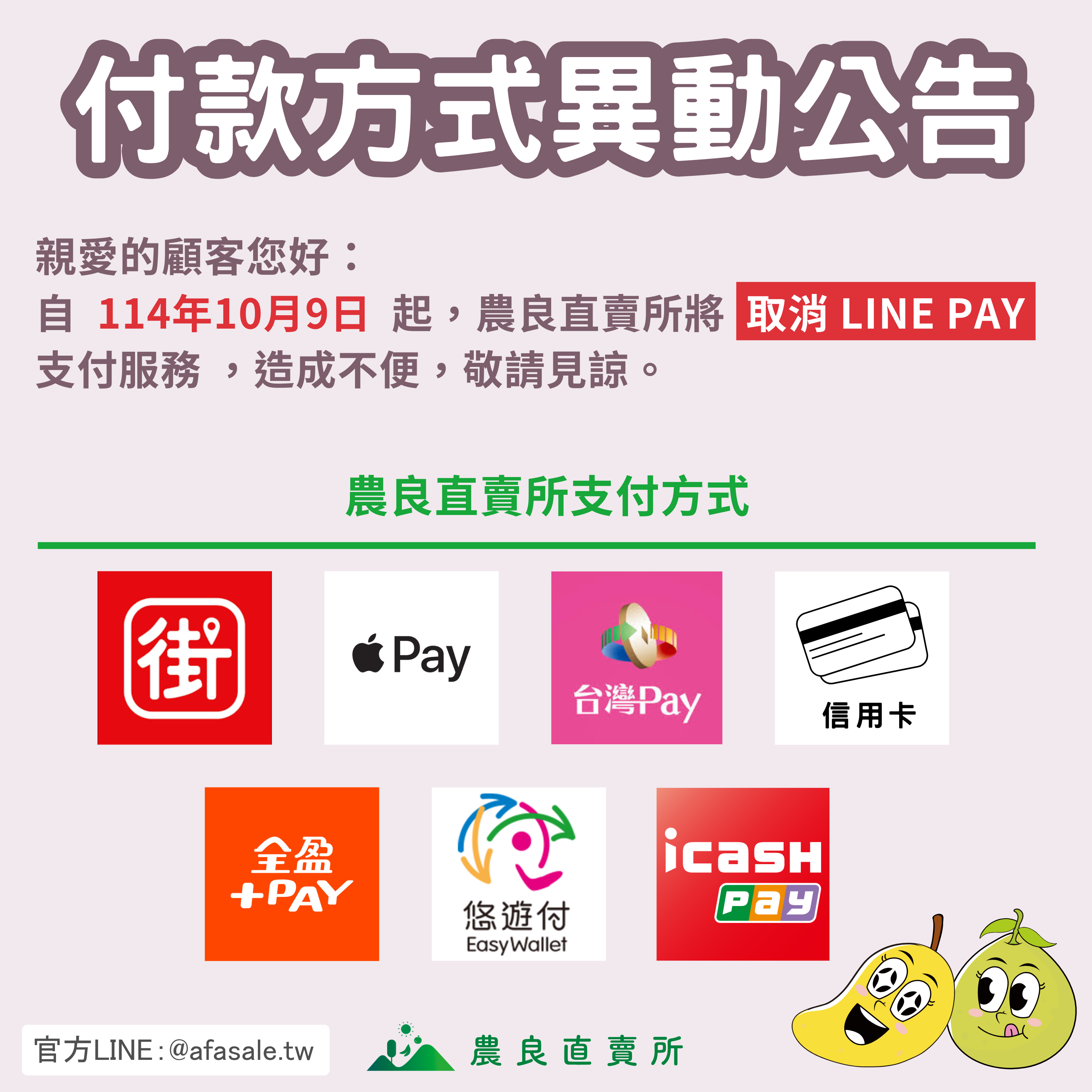 親愛的顧客您好,農良直賣所至114年10月9日起取消LINE PAY 支付服務,建議多加利用其他支付方式付款,造成不便敬請見諒。