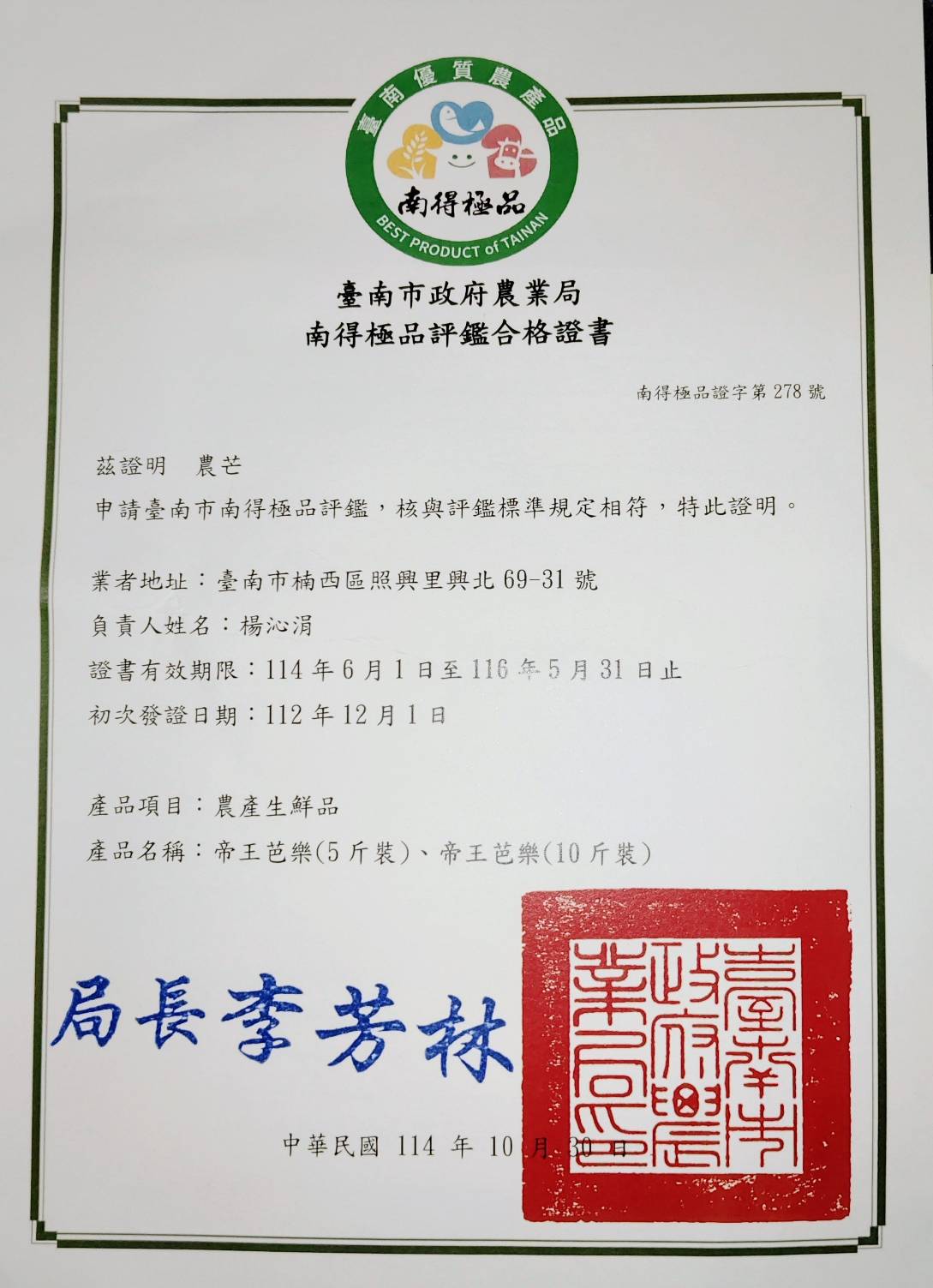帝王芭樂(台農一號)由農業部農業試驗所-鳳山熱帶園藝試驗分所育成,唯一技轉民間的芭樂品種,因種植門檻相當高且產量有限、市面上常供不應求,是台灣精品番石榴品種。