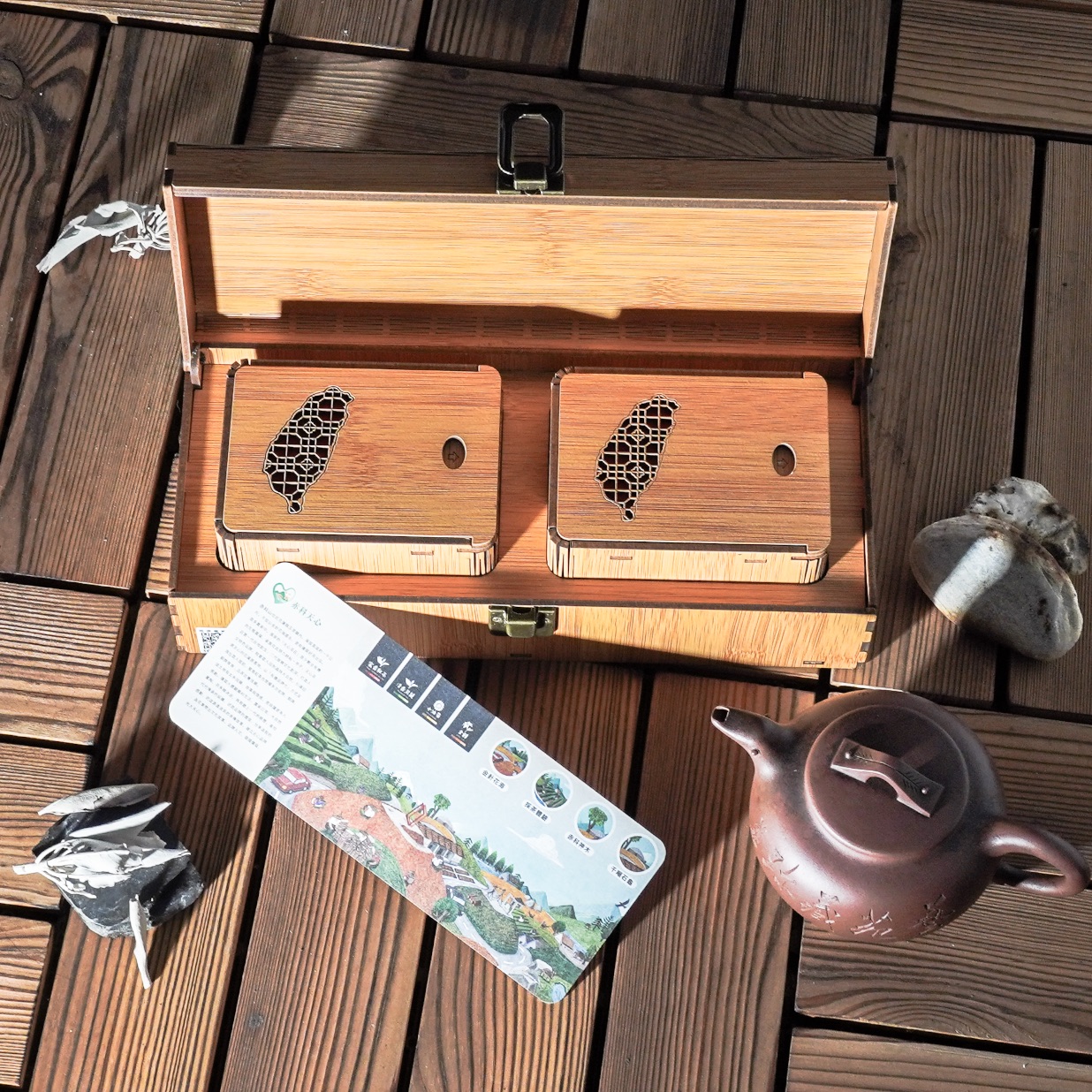 禮盒外包裝採木質竹紋設計,透過雷射雕刻呈現台灣著名地標景觀,結合文化意象與自然美感,兼具收藏與實用價值。整體設計環保典雅,附精緻提袋,無論自用或送禮皆十分體面。