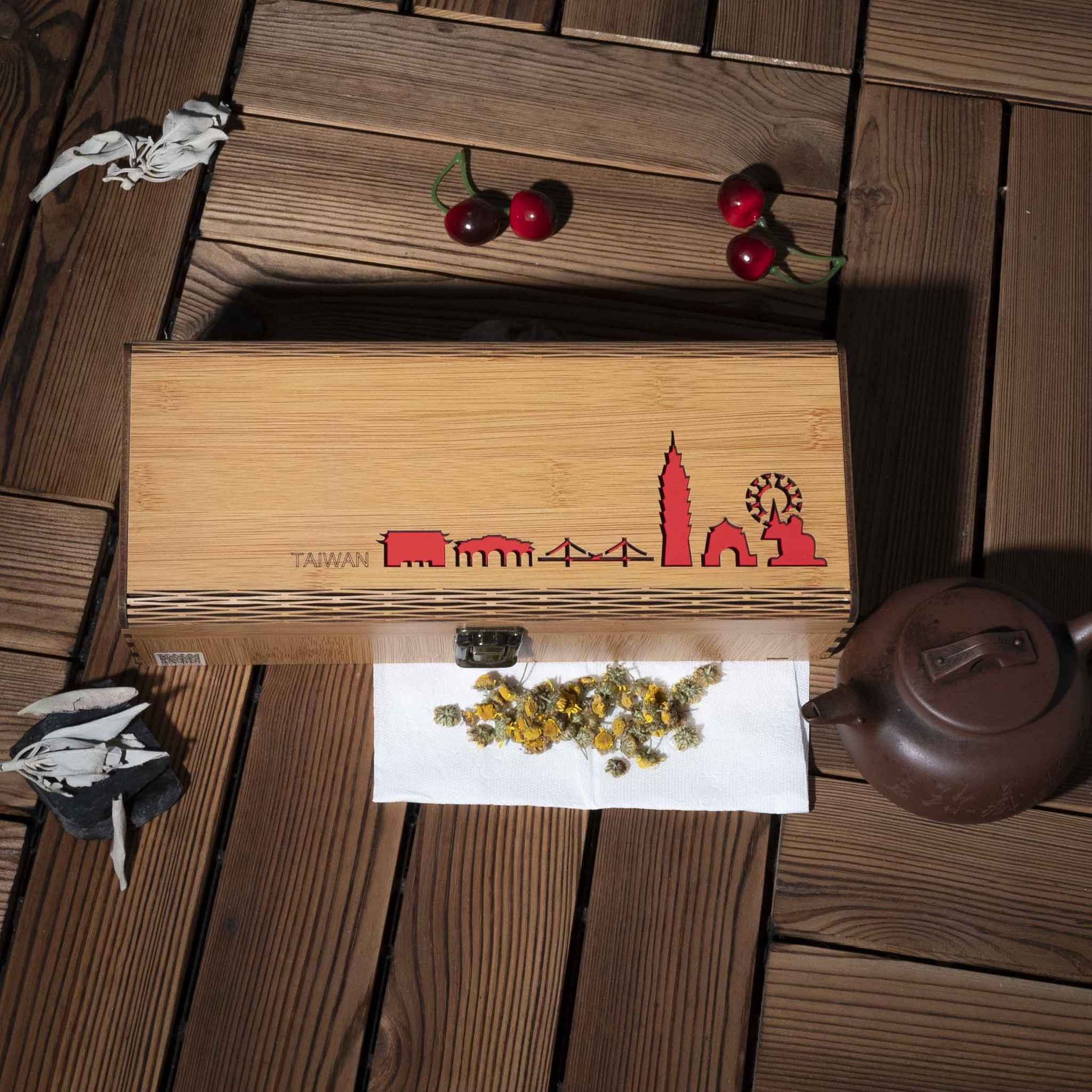 精選花蓮赤科山多款特色茶飲,搭配台灣特色竹紋木質禮盒設計。外盒以雷射雕刻呈現圓山飯店、自由廣場、關渡大橋、台北101與美麗華摩天輪等台灣地標意象,質感典雅、環保大方,深受國際旅客喜愛,是展現台灣風味的特色伴手禮。