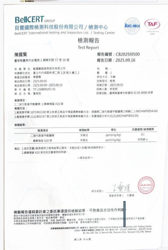 拿起松谷出產的大目釋迦,果實非常大顆漂亮,目開溝黃,正是最適合的熟度,雙手剝開馬上聞到撲鼻的釋迦香氣,一目一目的果肉吃起來完全不會軟爛,還有一點Q,甚至還帶有一絲蜂蜜的味道相當高雅迷人,如此頂級的大目釋迦正是他們引以為傲的招牌農產品。