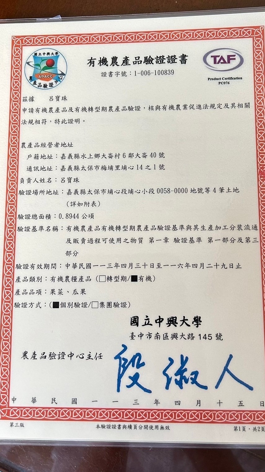 *TAF有機認證證書字號:1-006-100839