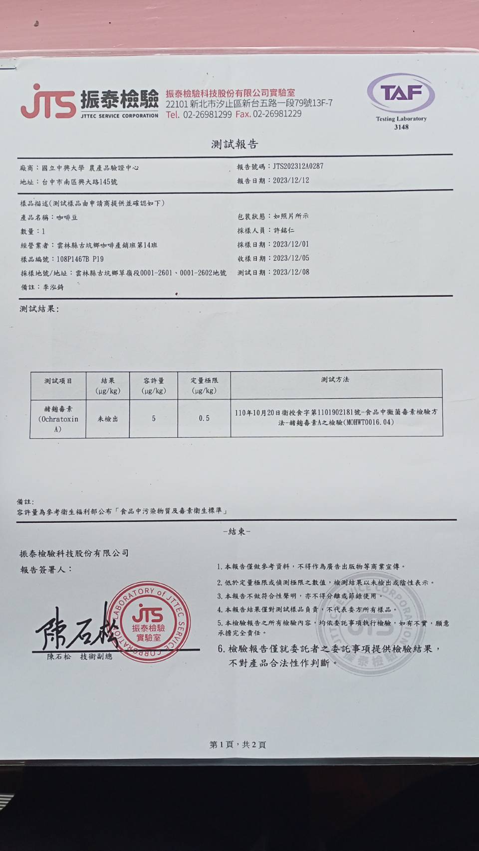 🎀檢驗報告-赭麴毒素 未檢出