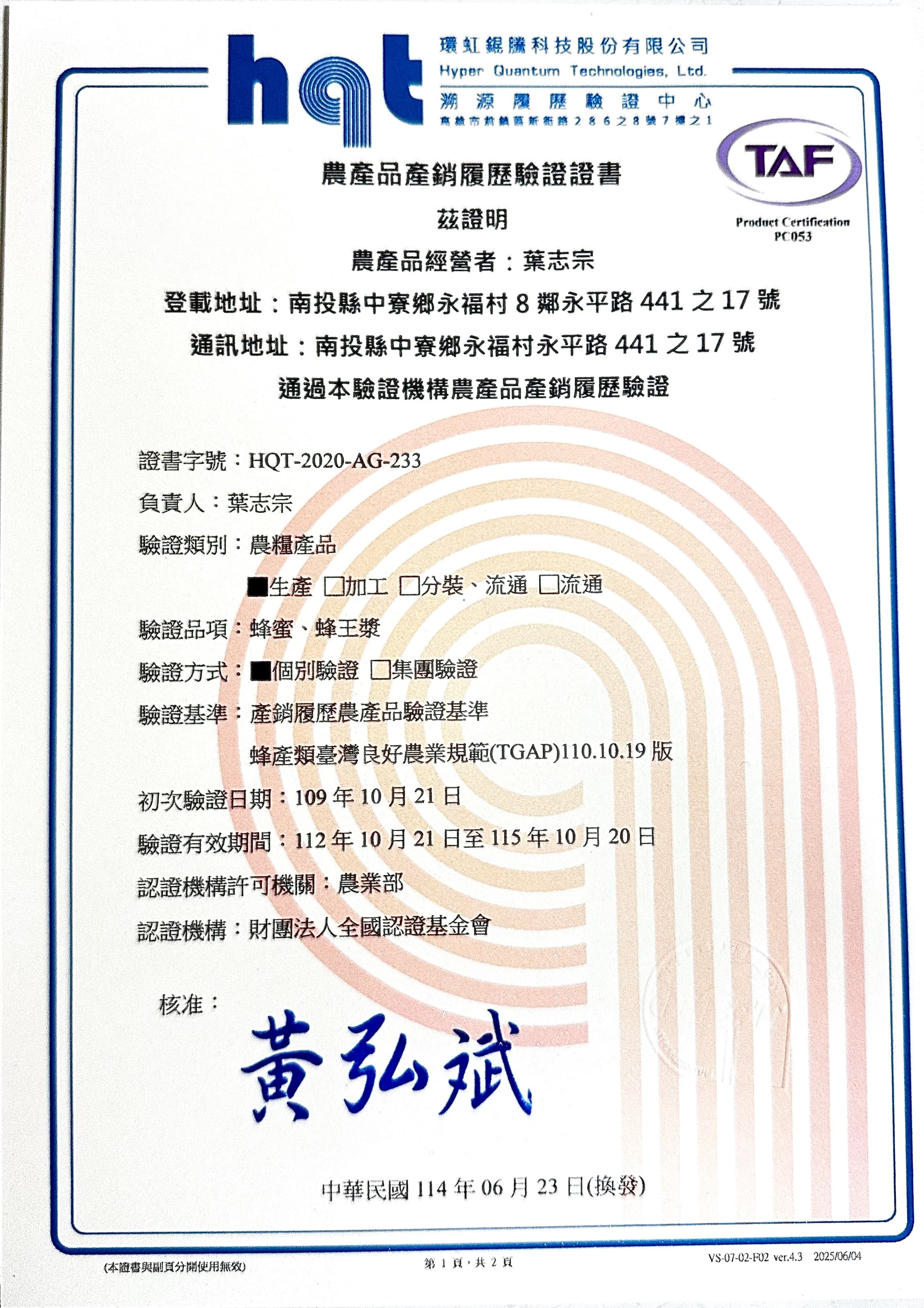◎台灣養蜂協會推廣之「國產蜂產品證明標章」。