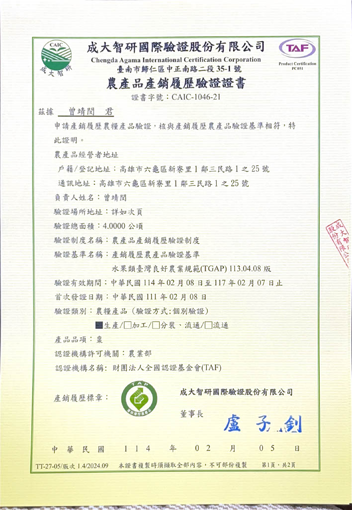 高雄六龜,依靠荖濃溪純淨灌溉,水源清澈,孕育出最天然的蜜棗美味。全程採用網室栽培,避免蟲害與鳥害,同時草生栽培確保土壤健康。配合大量有機肥培育,以及定期灌溉光合菌,結果期間使用物理防治及生物農藥,從結果到採摘,都以可追溯的管控模式守住高品質,並通過農糧署「產銷履歷驗證」,為每一顆蜜棗掛保證!